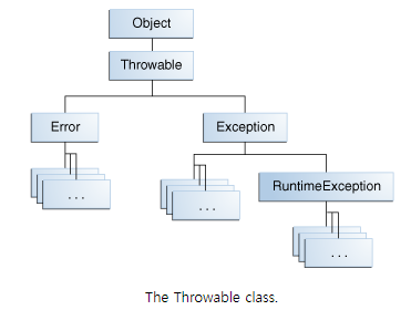 Exception과 Error 모두 Throwable class의 자손인데, Error는 OutofMemoryError, StackOverflowError 등 발생하면 복구할 수 없는 심각한 오류이고, 예외는 에러에 비해 대처하기 쉬운 것을 말한다.