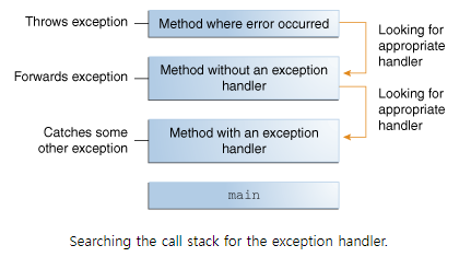 에러는 프로그램 실행 중에 오작동을 하거나 비정상적으로 종료되는 원인이다. exception은 에러 중에서도 프로그램 코드에 의해 수습될 수 있는 미약한 오류를 말한다. 에러가 발생하면 exception object가 생성되는데, 어떤 error인지 언제 발생했는지에 대한 정보를 가지고 있다. exception object를 만들고 runtime system에 넘겨주는 것을 throwing an exception이라고 한다. exception을 throw하고 나면 아래 그림처럼 호출스택에서 에러가 발생한 method에서 시작해서 자신을 호출한 순서대로 exception을 처리할 수 있는 method를 찾는다. 만약 호출스택을 전부 확인했는데 아래 그림과 다르게 exception을 처리할 수 있는 method가 없다면 비정상적으로 시스템이 종료된다.
