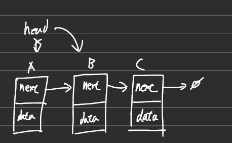 연결 리스트는 head라는 노드로 시작한다. head는 항상 리스트의 첫 요소를 가리킨다. 우리는 head의 노드밖에 접근할 수 없기 때문에 B, C, D를 부를 때 head를 통해 A를 부르고 head.next를 통해 B를 부르는 방식으로 찾고자하는 값을 탐색한다.