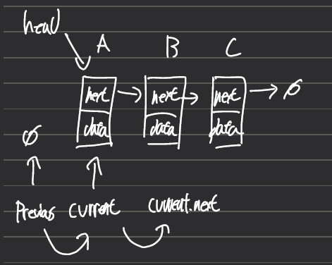 previous는 처음에 null을 가리키고, current는 head를 가리킨다. 그리고 previous를 current로 그리고 current를 current.next로 옮기면서 current가 마지막에 있는지 체크한다. curren == tail이거나, current.next == null 일 때, current가 마지막 노드를 가리킨다는 의미인데, 구현할 때는 current.next가 NullPointerException을 발생시킬 수 있으니 current==tail을 선호한다.
