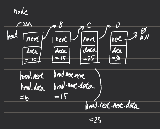 위에서 언급했듯이 마지막 노드에 접근할 때 head.next.next.next를 끝없이 사용하는 방법은 사용하지 않는다.