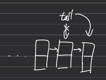 while문에서 null을 확인하는 과정의 시간복잡도는 O(n)이다. 그런데 만약 tail 포인터를 만들어서 tail이 항상 마지막 요소를 가리키게 하면 마지막 요소를 빠르게 찾을 수 있다.