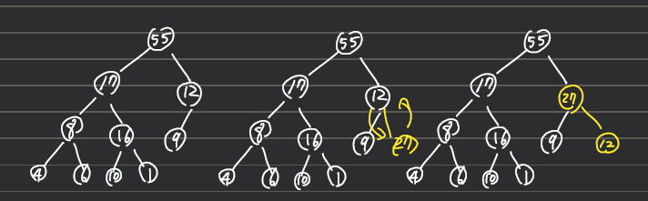 트리의 마지막 요소를 루트 자리에 넣어주는 이유는, 트리의 마지막 요소를 루트에 넣지 않고 자식 노드를 하나씩 올려주는 과정을 반복하면, 최악의 결과로 완전이진트리를 만족하지 못해서 트리를 재구성해야하는 상황이 생길 수도 있다.