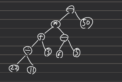 중위 표기식 : ((22/11) + 3)*(6+5))-50