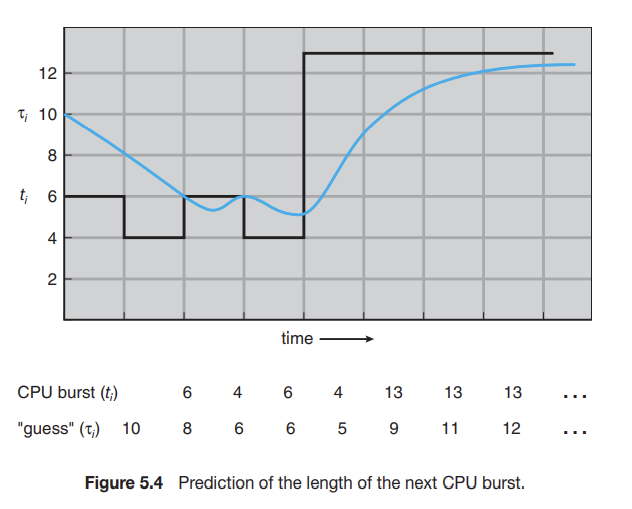 - 하지만 다음 프로세스의 CPU 버스트를 예상할 수 없어서, 프로세스의 이전 CPU 버스트를 이용해서 다음 CPU 버스트를 예상합니다.