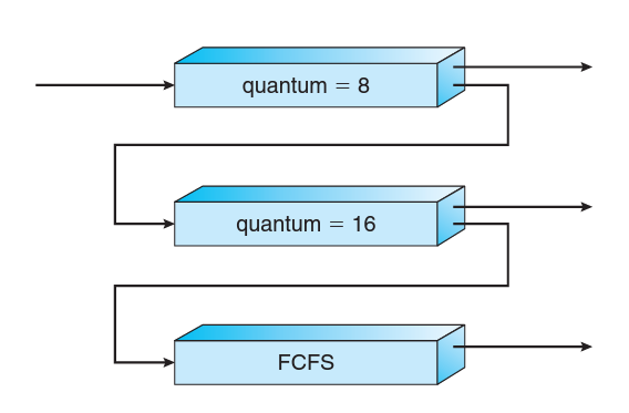 예를 들어 아래와 같이 3개의 우선 순위 큐를 갖는다고 합시다. 모든 프로세스는 처음에는 time quantum이 8ms인 0번 우선순위큐로 들어갑니다. 0번 큐에 프로세스가 없어야 1번큐 (quantum = 16ms)가 실행될 수 있고, 1번큐가 없어야 2번큐(FCFS)가 실행될 수 있습니다. 이렇게 설계하면 8ms 이하의 짧은 버스트를 가지는 프로세스가 금방금방 처리돼서 대기시간을 줄일 수 있고, 버스트가 긴 프로세스는 낮은 우선순위의 큐로 이동시킬 수 있습니다. 대신 우선순위가 낮을수록 실행될 기회가 적으니 quantum을 점점 늘려서 차례가 오면 프로세스를 끝내버리는 것입니다.