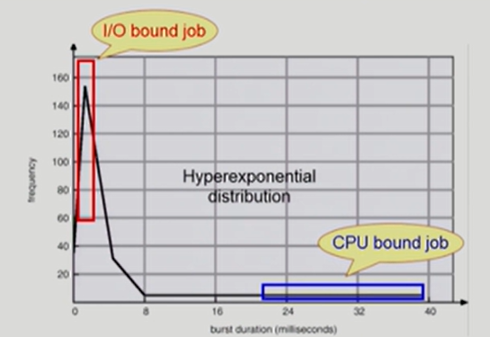 위 그래프는 CPU 버스트가 짧은 프로세스부터 긴 프로세스까지 빈도의 분포를 보여주는 그래프이입니다. 빈도를 확인해보니 CPU 버스트가 짧은 프로세스 즉 중간에 I/O작업을 수행하는 경우가 많고 CPU만 길게 사용하는 경우는 빈도가 굉장히 낮아보입니다. CPU를 짧게 쓰고 I/O 작업이 빈번하게 일어나는 프로그램을 I/O 바운드 잡이라고 부르고 반면 CPU만을 오랫동안 사용하는 프로그램을 CPU 바운드 잡이라고 부릅니다.