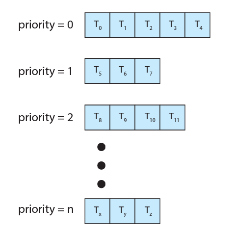 이전의 레디큐는 프로세스들이 한줄로 대기하고 있었는데, 이후 소개되는 multilevel queue를 사용하면 여러 줄의 큐로 대기할 수 있습니다. Priority와 라운드 로빈 스케쥴링을 함께 사용하면, 모두 같은 큐에서 대기하기 때문에, 가장 우선순위가 높은 프로세스를 찾을 때 O(n)의 시간복잡도가 필요합니다. 그래서 실제로는 우선순위마다 큐를 분리하는 것이 유용할 때가 있습니다. multilevel queue를 사용해서 큐마다 우선순위를 부여해서 우선순위가 높은 큐부터 실행하는 것입니다. 같은 큐에 있는 프로세스들은 우선순위가 같기 때문에 그 때는 라운드로빈으로 순서가 정해집니다.