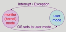사용자 프로그램 중에 Interrupt나 Exception 발생하면 프로그램을 멈추고 커널모드로 바꾸기 위해 모드비트를 0으로 바꿉니다. 모드비트가 0이 됐으므로 CPU가 운영체제에게 넘어가고 메모리나 I/O 디바이스에 접근할 수 있습니다. 그리고 커널코드가 끝나고 처리가 완료되면 다시 유저모드로 바꿉니다. 모드비트를 1로 바꾸고 중단됐던 프로그램의 CPU상태를 복원하고 사용자 프로그램이 CPU를 점유하게 됩니다.