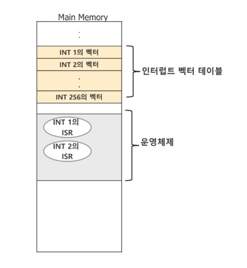 - 인터럽트 벡터 : 인터럽트의 처리 루틴을 저장하는 메모리의 주소를 가리키는 벡터