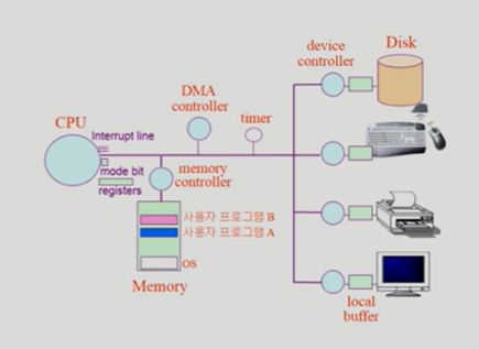 컴퓨터 시스템은 CPU와 메모리로 구성돼 있습니다. 그리고 I/O 디바이스를 통해 데이터를 입력하거나 결과를 출력할 수 있습니다. 각 디바이스마다 전담하는 device controller가 있고, device가 작업을 수행할 때 데이터를 버퍼에 저장합니다. CPU에 I/O 작업이 끝난 것을 알려주기 위해 device controller가 인터럽트를 걸고, CPU가 버퍼의 데이터를 메인 메모리에 복사합니다.